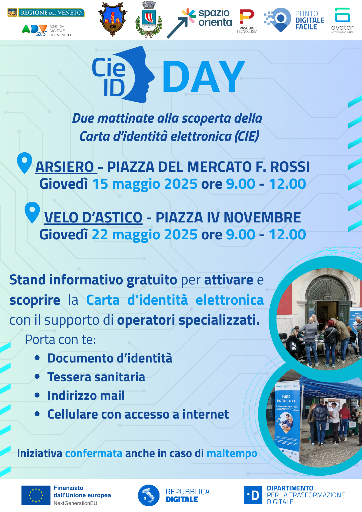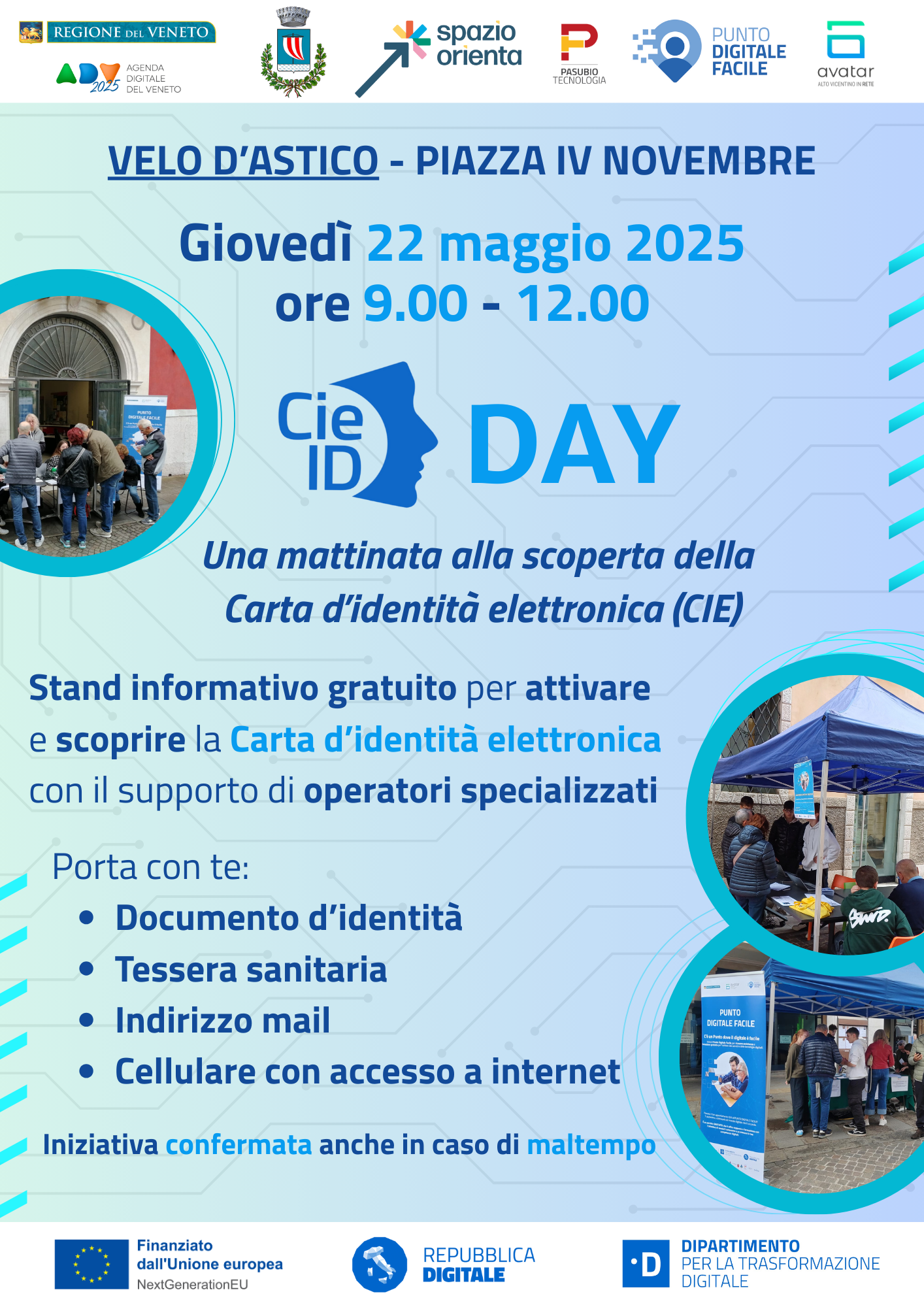 Gli Sportelli Spazio Orienta, in collaborazione con il Progetto AVATAR, organizzano due eventi informativi dedicati all'attivazione della Carta d'Identità Elettronica (CIE) e alla scoperta delle sue principali funzionalità digitali.Durante la mattinata i cittadini avranno la possibilità di accedere liberamente allo stand per attivare le proprie credenziali CIE e ricevere assistenza digitale gratuita su dubbi e domande riguardanti le identità digitali.